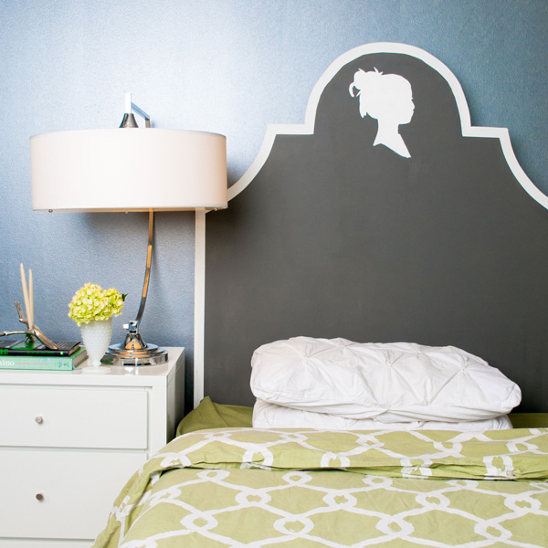 Project #2 is from Maureen of The Inglenook Decor who was contacted by HGTV.comto create a budget-friendly DIY headboard that they wanted to feature. Maureen started the project by stalking Craigslist for somebody who could make a wood cutout, used leftover chalkboard paint and primer paint, dustless chalk (who knew?!?!) and a favourite vintage silhouette. I LOVE how it turned out. (Photos by Chris, silhouette image courtesy of Susie Harrington of Petite Prints).