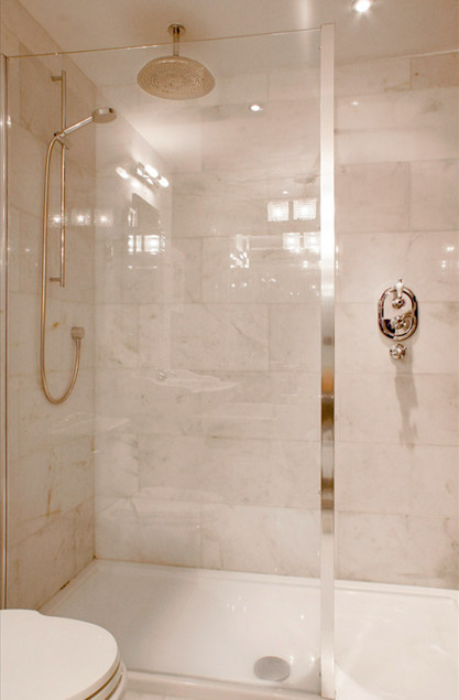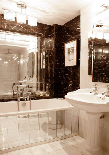 Wow great space. The reason I love white walls and floors because the pieces stand out and make them almost like they are floating. That mirrored tub is awesome.