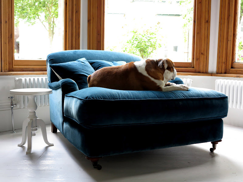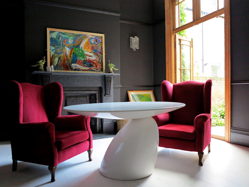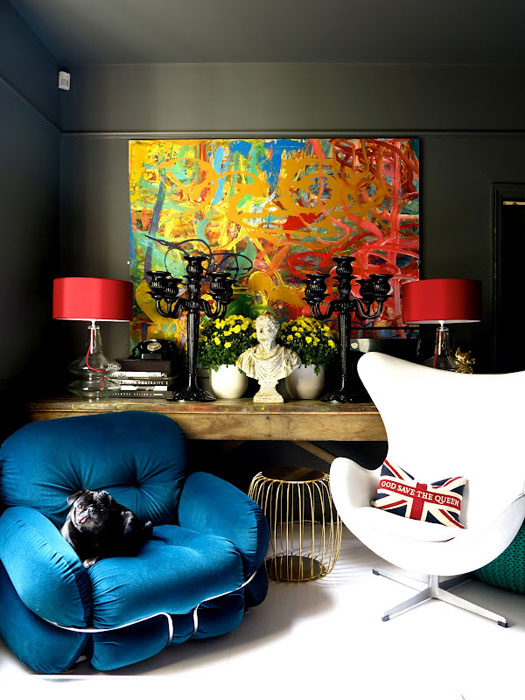 What an amazing home! I love the contrast between the dark walls and light floors and visa versa with bright eclectic accents! The puppy is adorable too 🙂