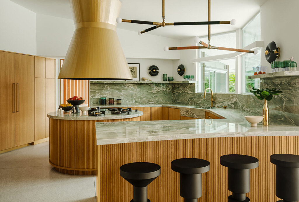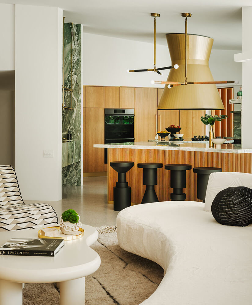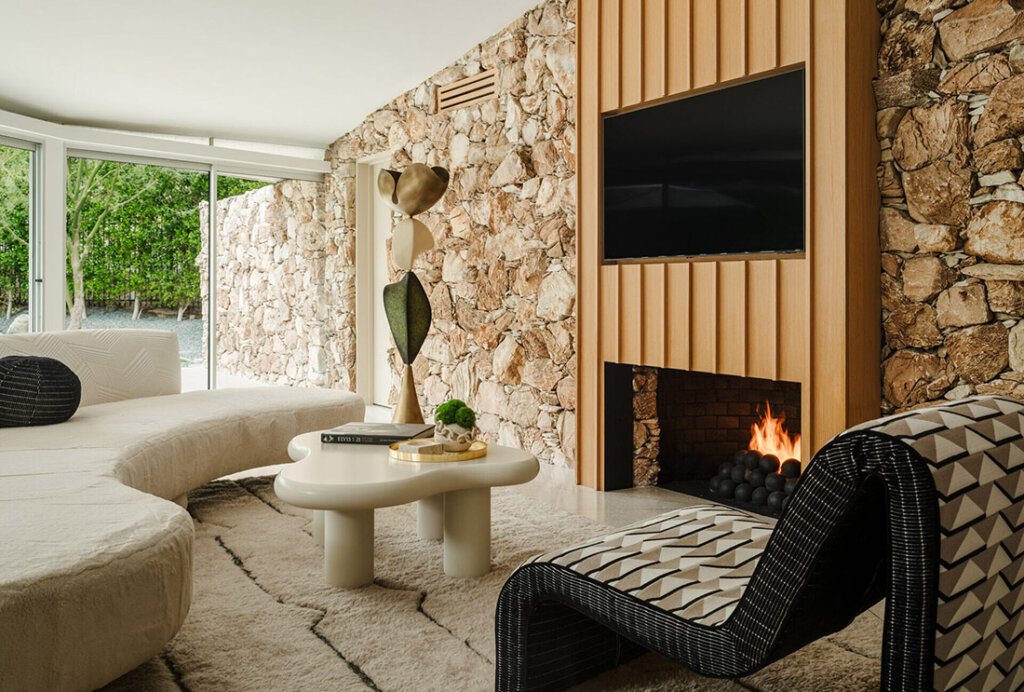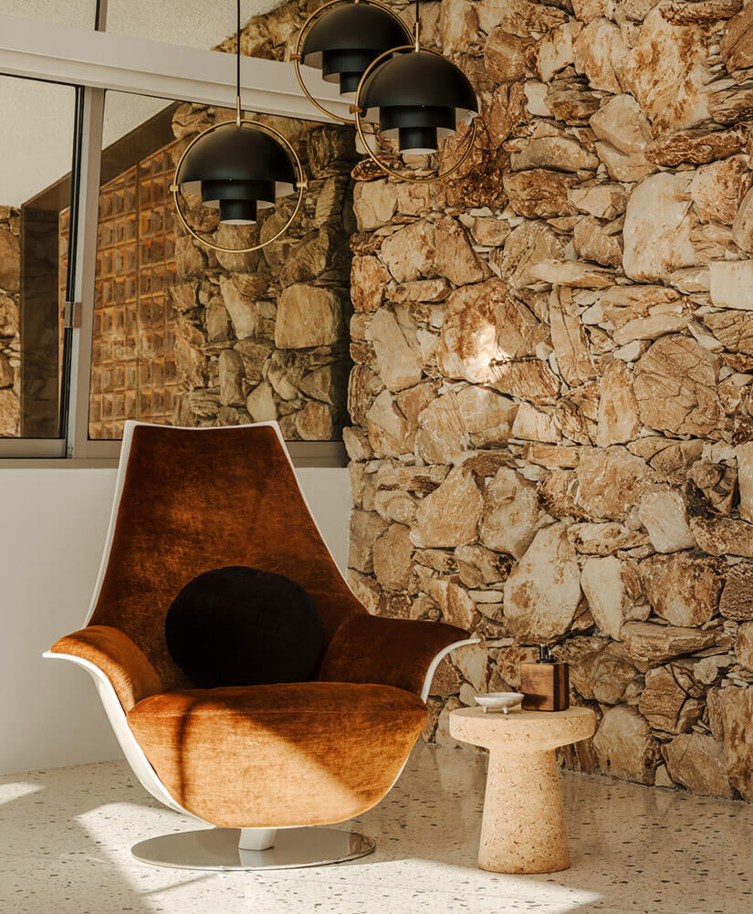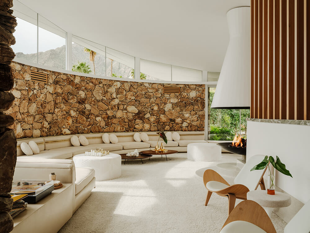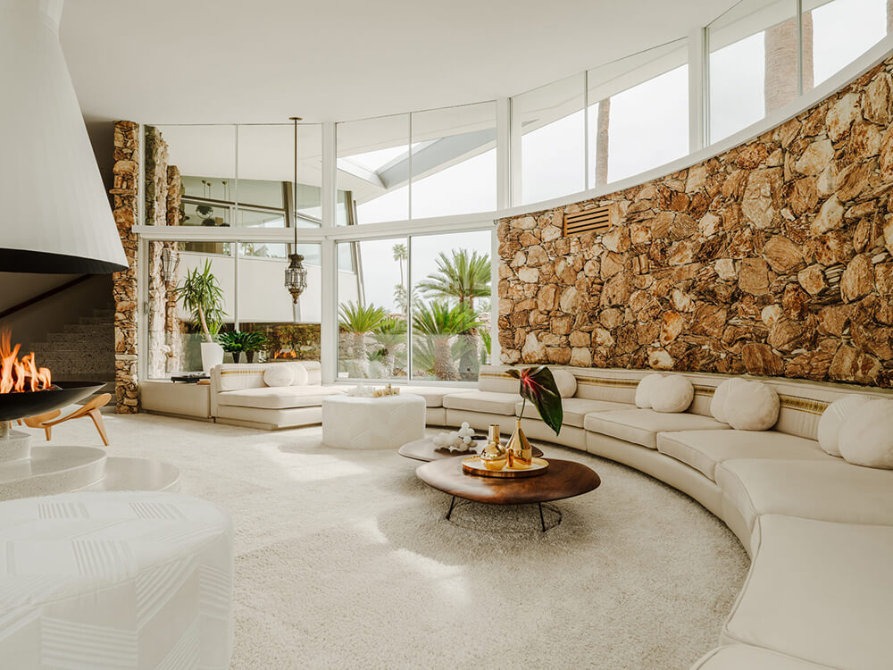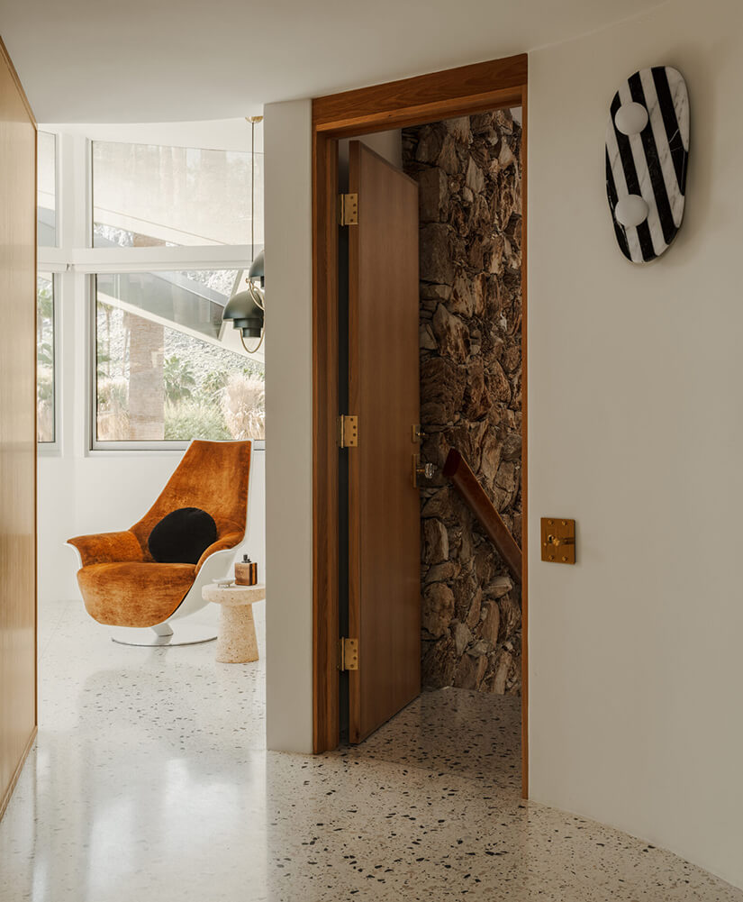 This home in Palm Springs is a midcentury DREAM! House of Tomorrow was the home Elvis and Priscilla were to be married in but instead became their honeymoon hideaway. New owners purchased it in 2021 and with the help of designer Michelle Boudreau they sensitively reinvigorated the property, leaving the exterior seemingly untouched and gently modernized the interior. I am obsessed with that living room (rock wall, custom 14′ curved sofa, floating fireplace) and kitchen (verde allegre quartzite countertops, circular cooktop with custom exhaust hanging in the middle)! Photos: Lance Gerber.