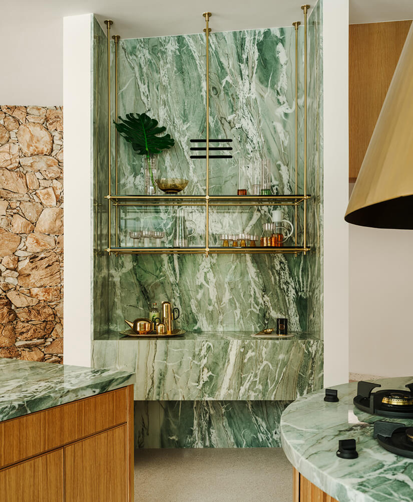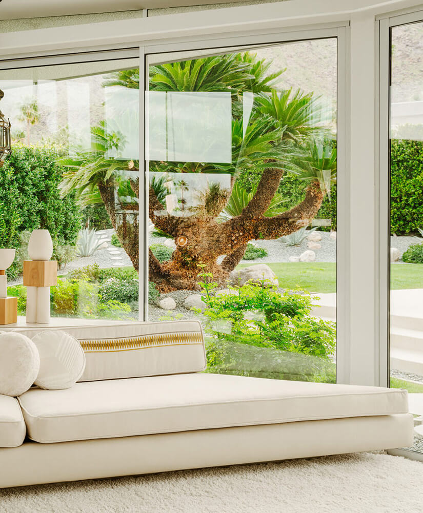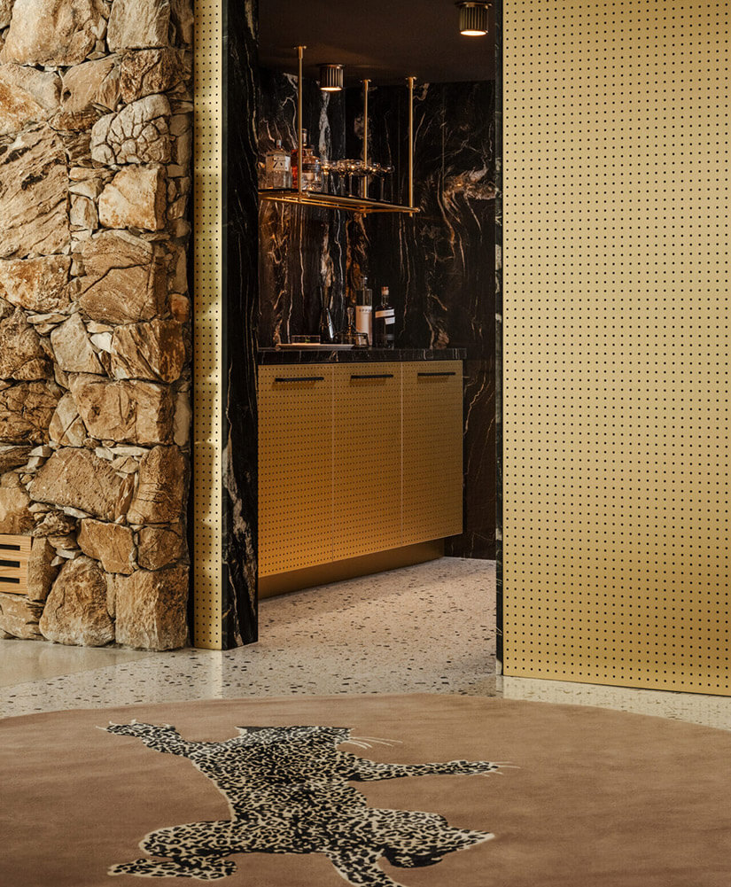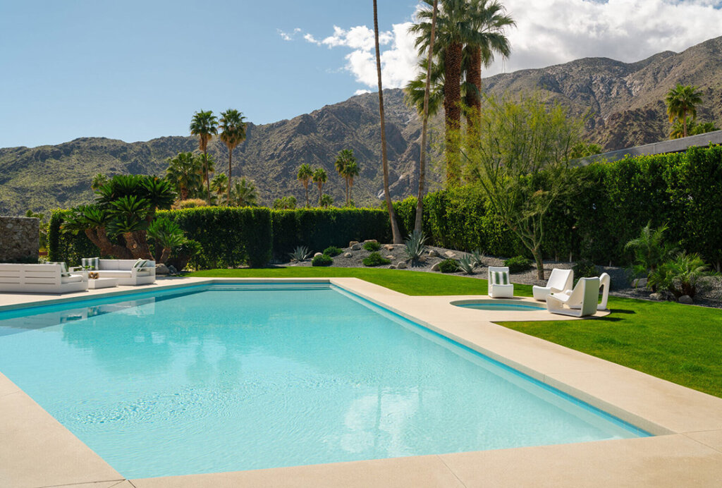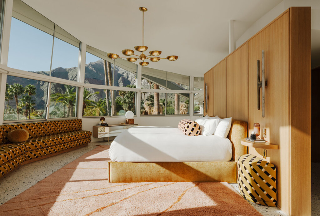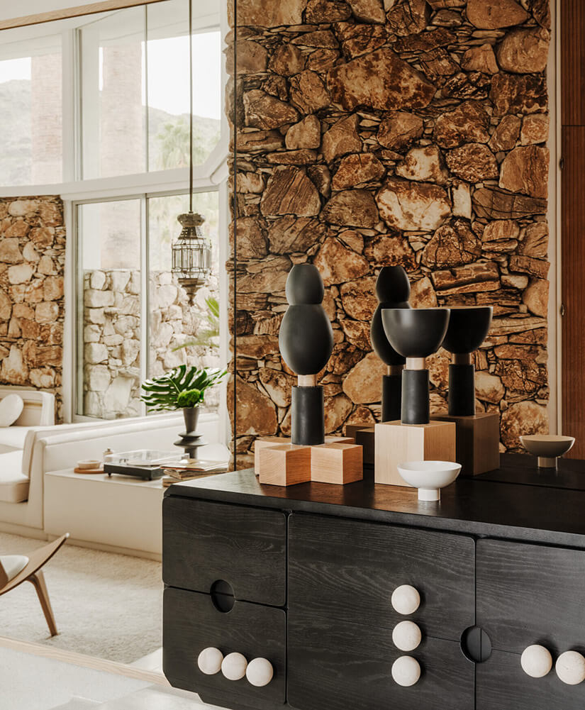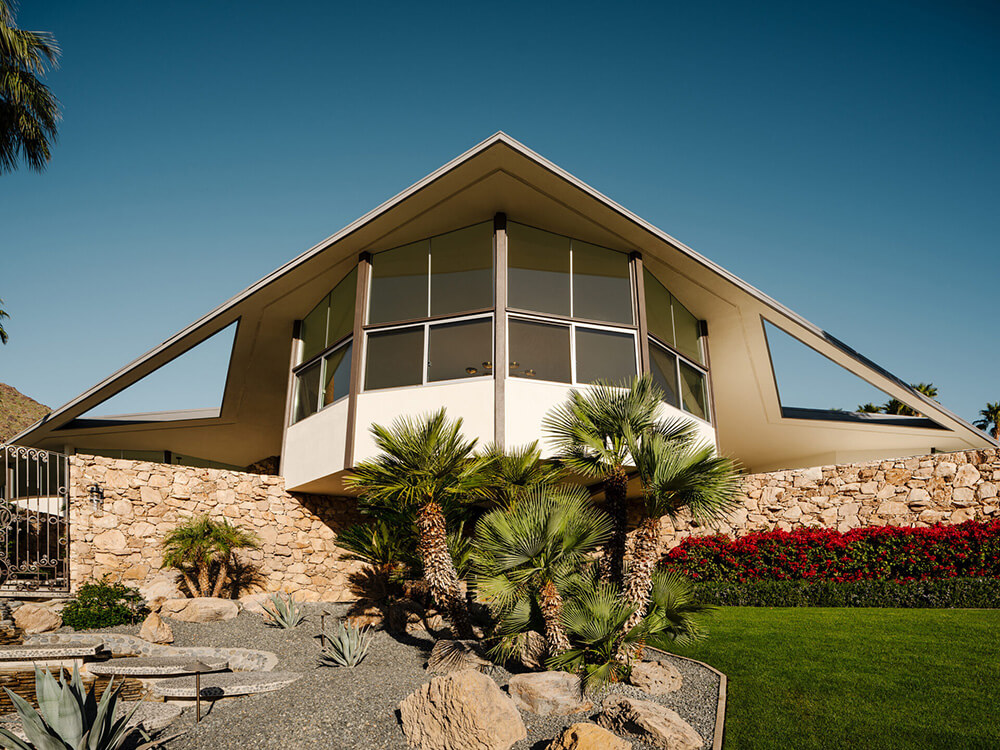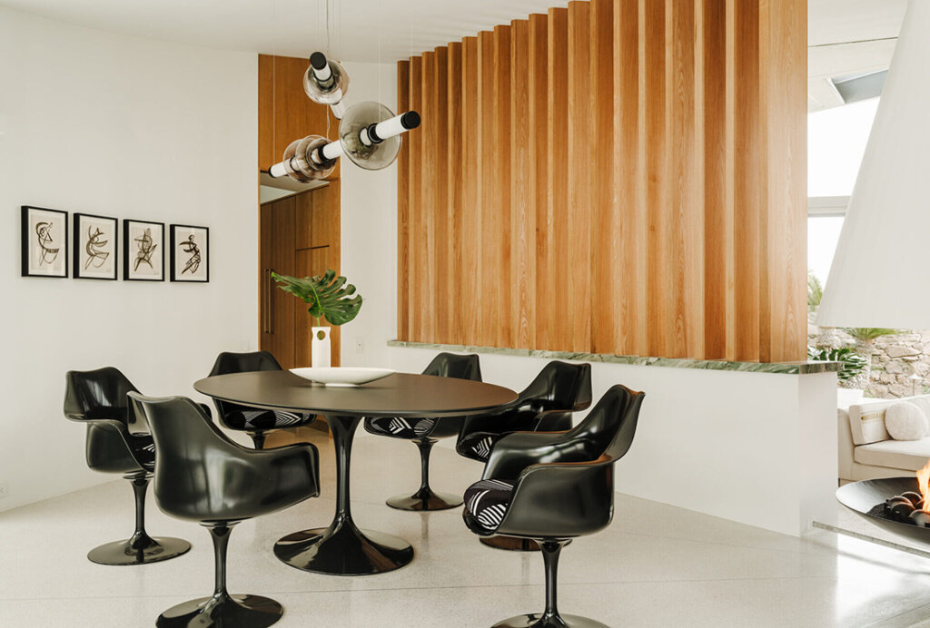 This home in Palm Springs is a midcentury DREAM! House of Tomorrow was the home Elvis and Priscilla were to be married in but instead became their honeymoon hideaway. New owners purchased it in 2021 and with the help of designer Michelle Boudreau they sensitively reinvigorated the property, leaving the exterior seemingly untouched and gently modernized the interior. I am obsessed with that living room (rock wall, custom 14′ curved sofa, floating fireplace) and kitchen (verde allegre quartzite countertops, circular cooktop with custom exhaust hanging in the middle)! Photos: Lance Gerber.