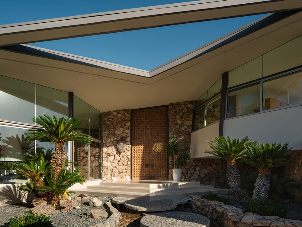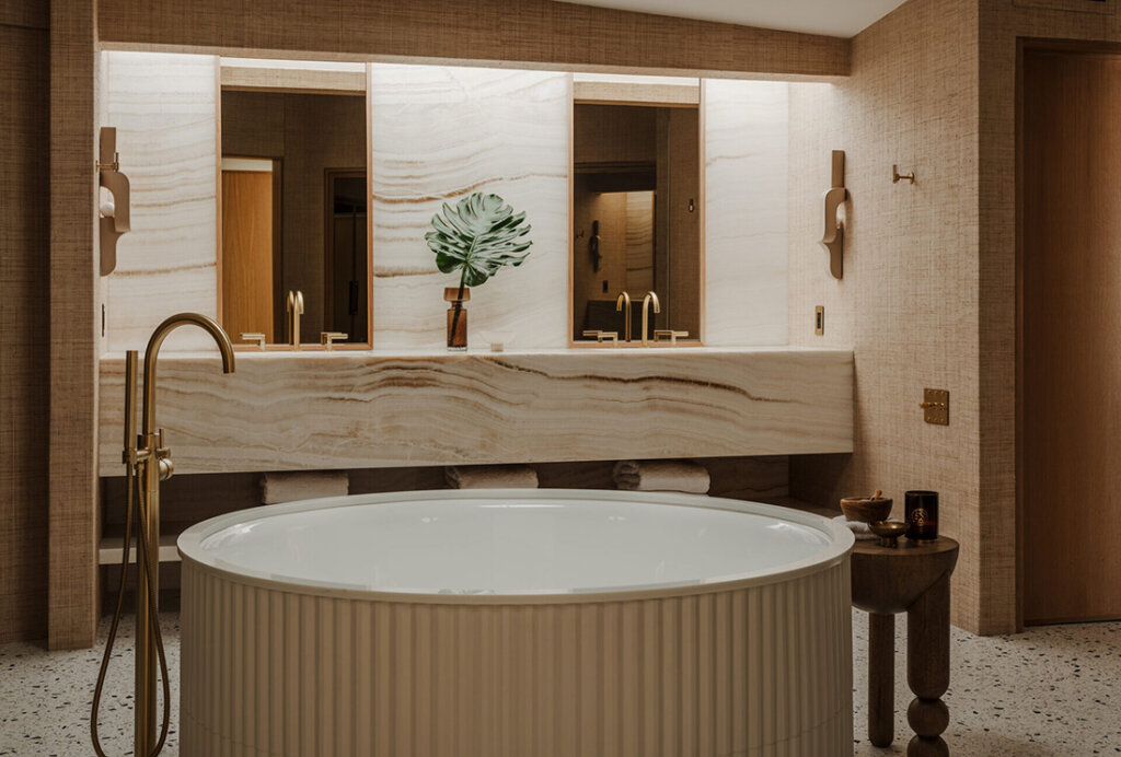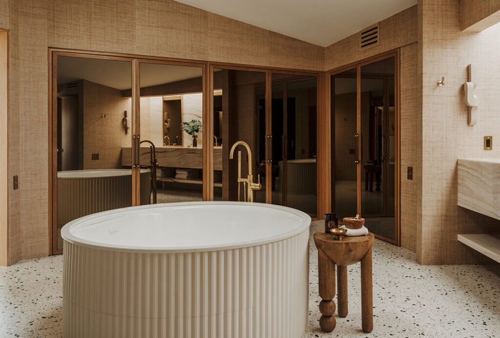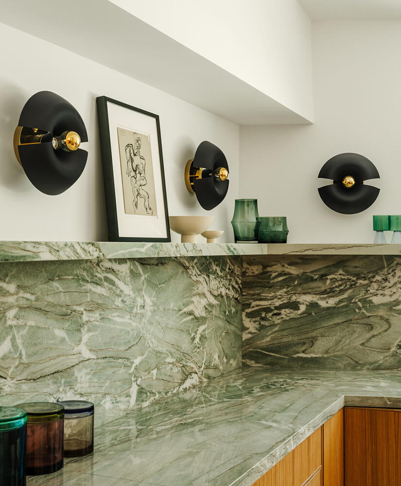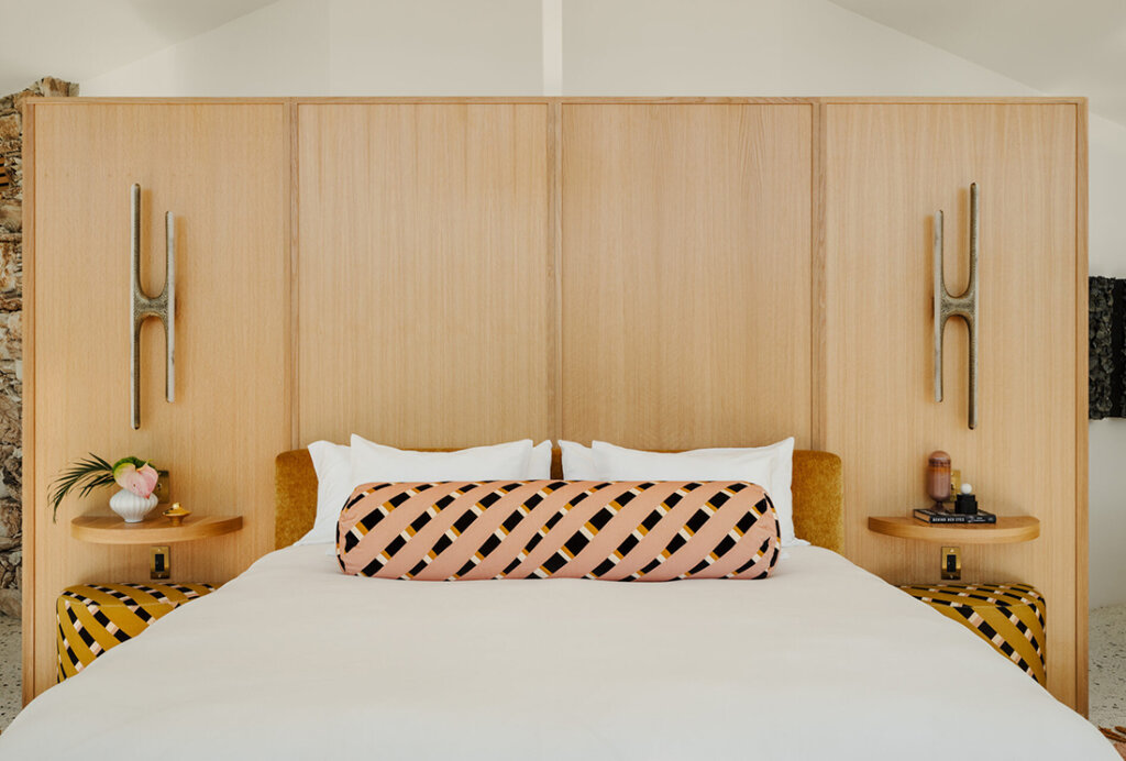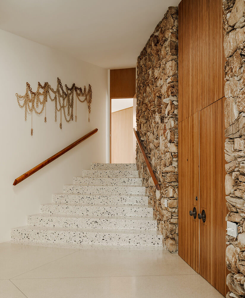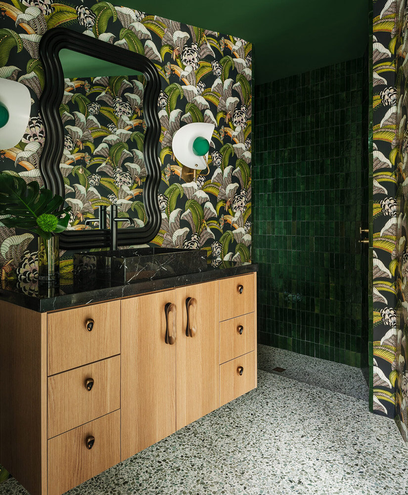 This home in Palm Springs is a midcentury DREAM! House of Tomorrow was the home Elvis and Priscilla were to be married in but instead became their honeymoon hideaway. New owners purchased it in 2021 and with the help of designer Michelle Boudreau they sensitively reinvigorated the property, leaving the exterior seemingly untouched and gently modernized the interior. I am obsessed with that living room (rock wall, custom 14′ curved sofa, floating fireplace) and kitchen (verde allegre quartzite countertops, circular cooktop with custom exhaust hanging in the middle)! Photos: Lance Gerber.