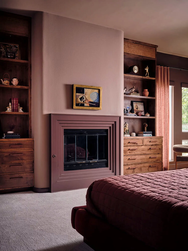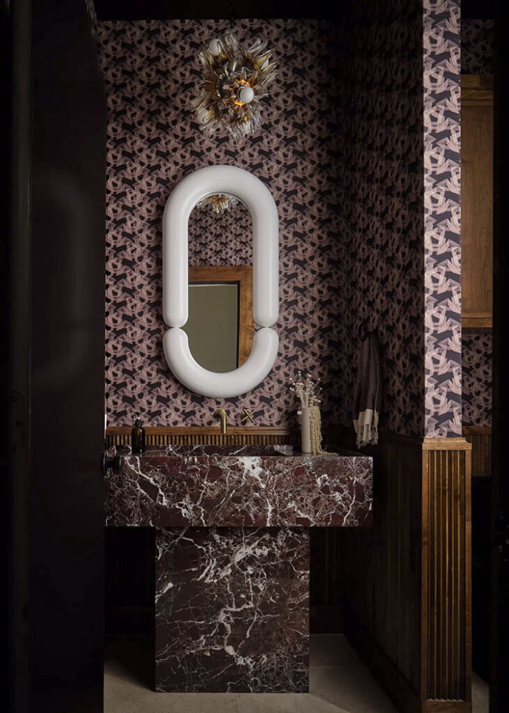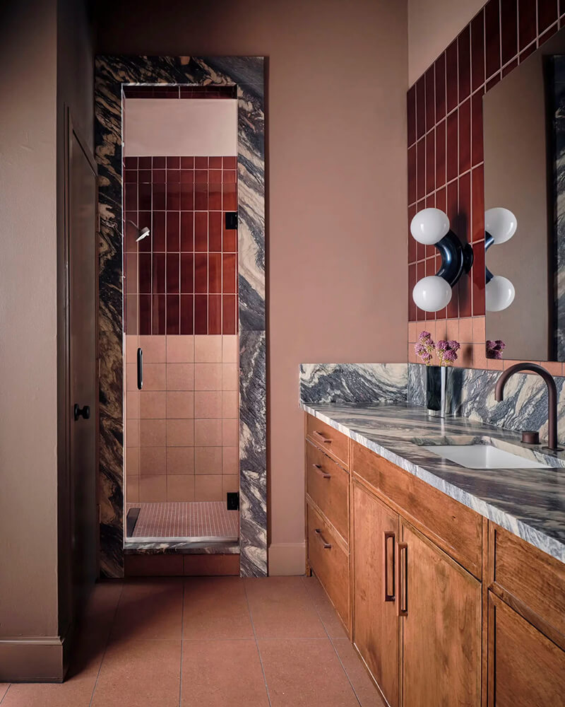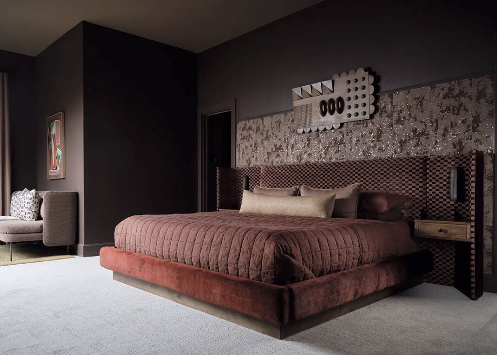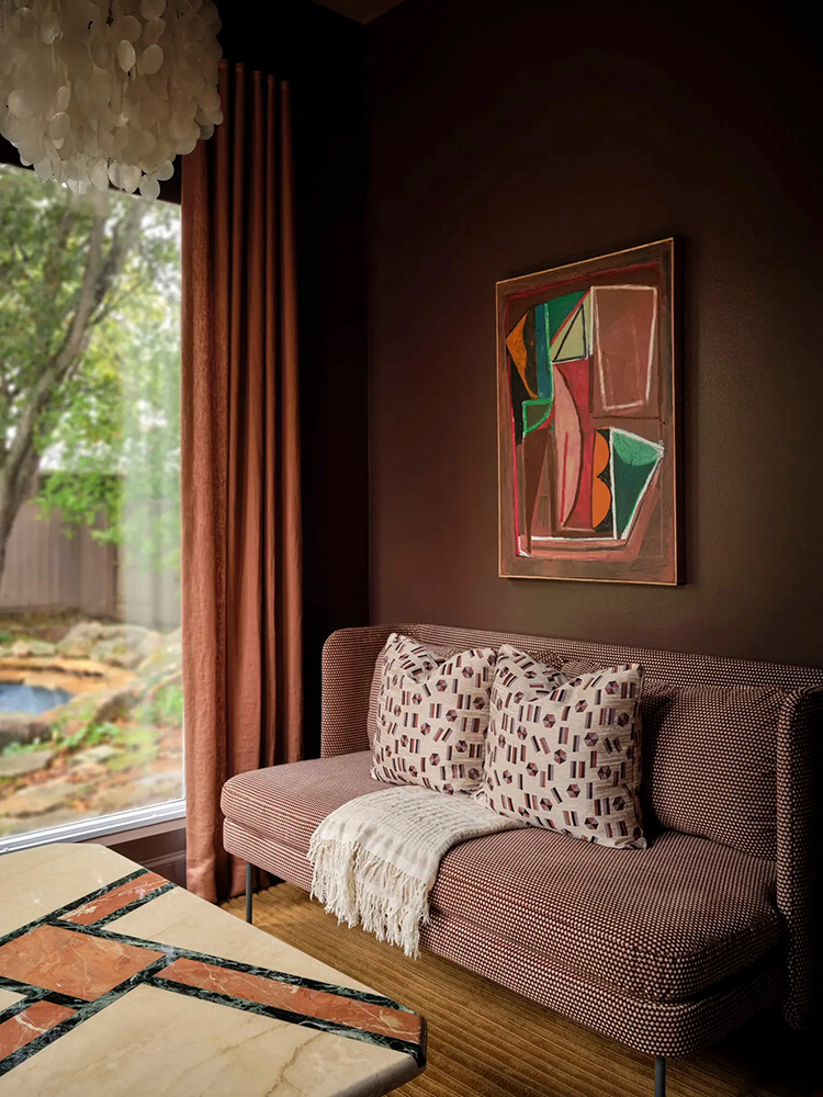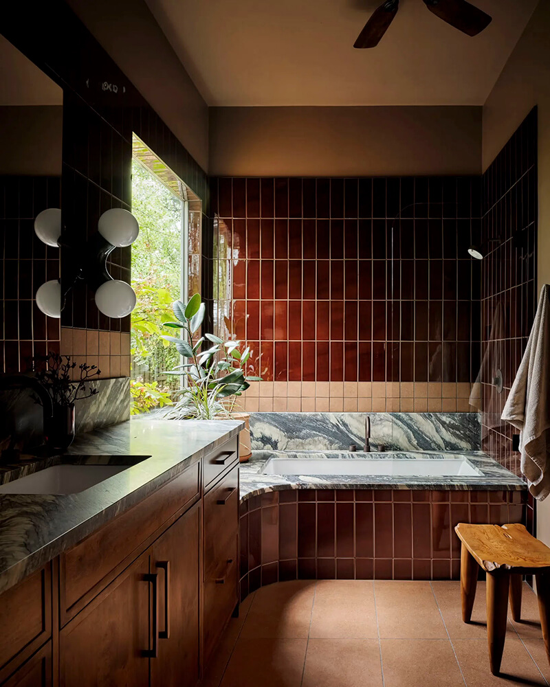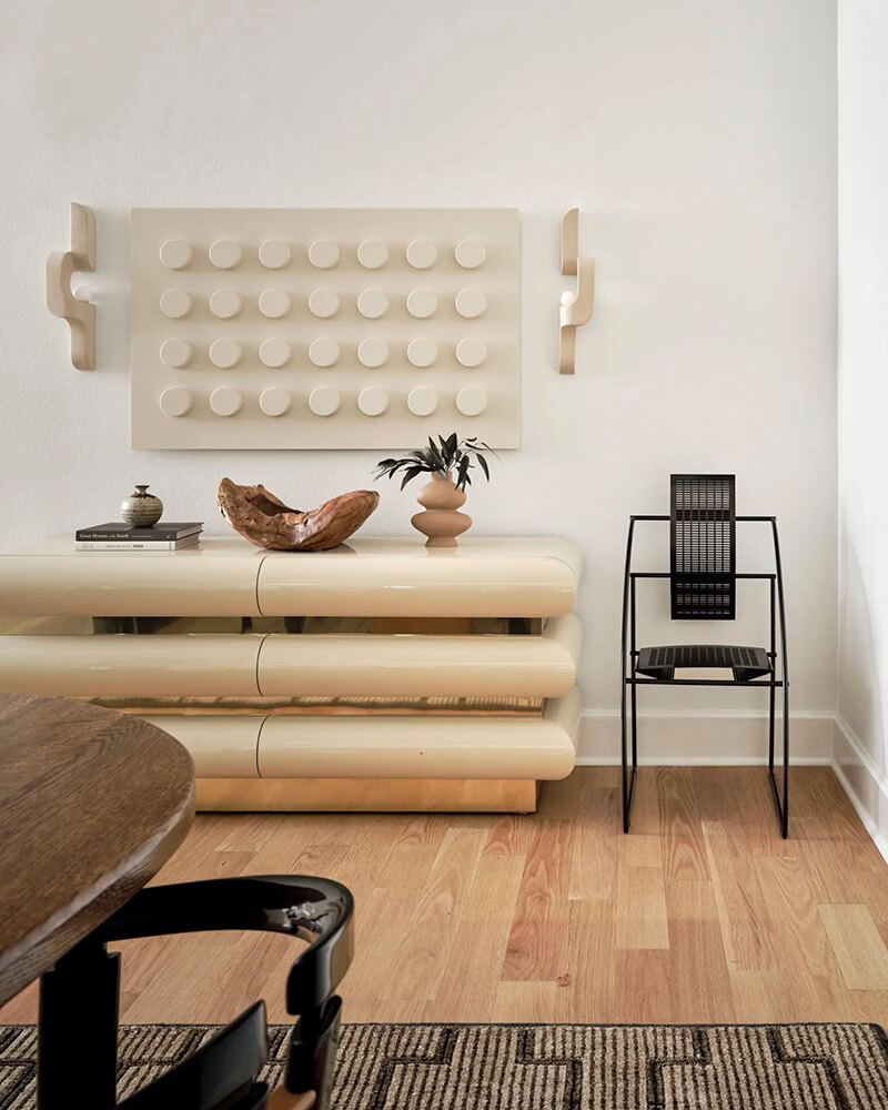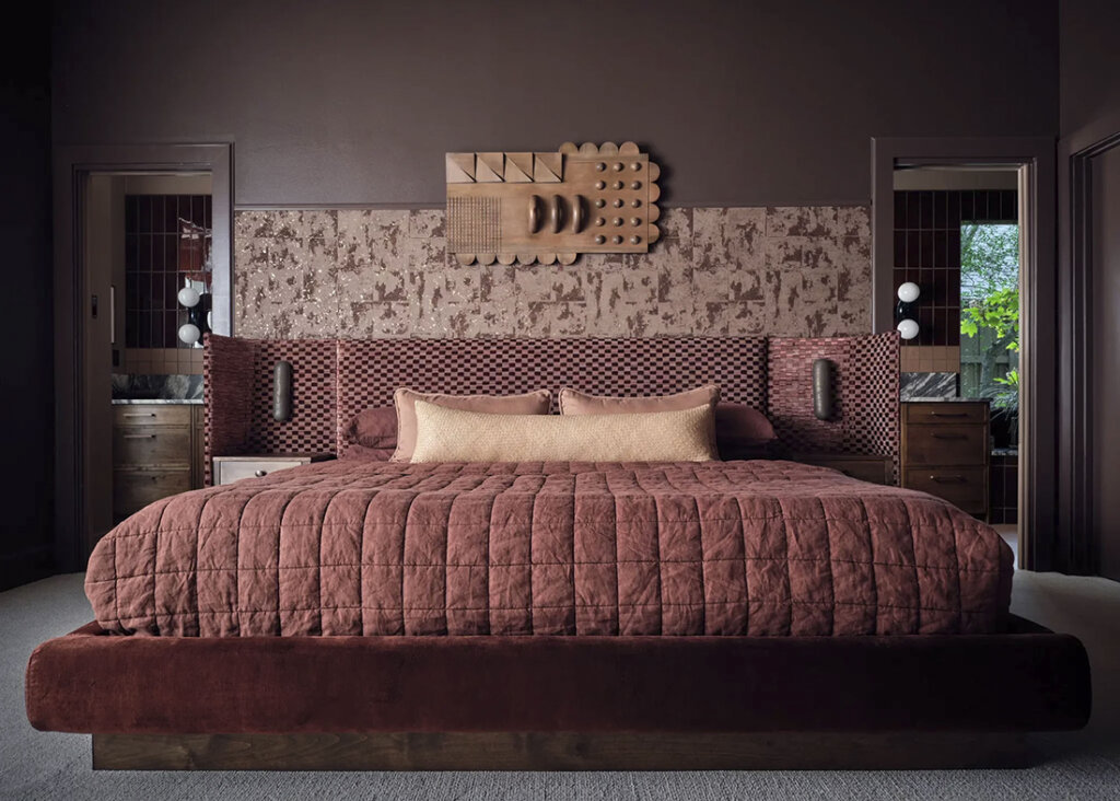 I adore postmodern design, and I feel like the world could use soooo much more of it. Bold colour choices, geometric patterns, shapely furniture that are often pieces of art themselves….it’s a vibrancy and creativity that really has a wonderful appeal and you can’t help but smile at. Designer Jen Talbot created such a fabulous home here with a more neutral colour palette in the main spaces (the brown and black accents add the pop postmodernism calls for) and then a huge wow factor in the main bedroom and children’s bathroom. The bedroom and ensuite colour palette is spectacular. Photos: Stephen Karlisch.