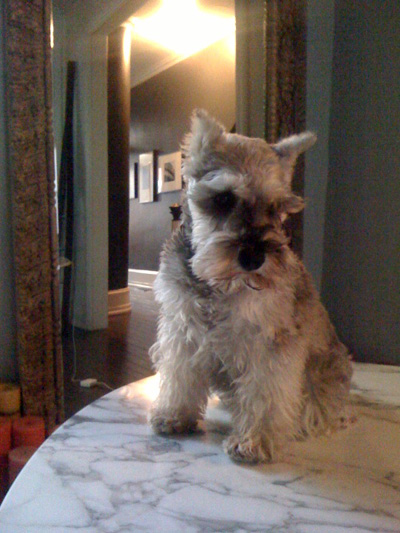 From the city of Philadelphia I am sending you this picture of our Miniature Schnauzer, Owen on our new Saarinen table.  He has been scratching at me all day to get up on it.  So I finally let him up and of course he posed for this adorable picture.