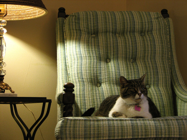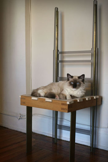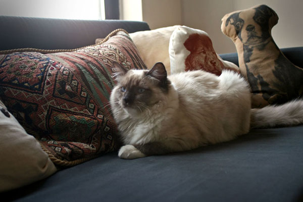 “My boyfriend Charles Brill and myself have a gorgeous 5 month old ragdoll kitty named Larry David.  We have taken a bunch of pictures I hope you will find fit in your pets on furniture post.  Just to mention, the chair and the bed in the pictures were made by Charlie who is 1/3 of the design group rich, brilliant, willing (www.richbrilliantwilling.com) – you may have seen their stuff around.”