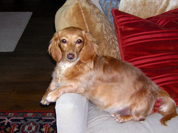 Attached are two pics of our long-haired dachshund, Zuzu. When she’s not being a tumor and following us all around the house, she’s hanging out on the couch. She always seems to be posing, ready for her close-up. We call the second one her sorority pose!“….