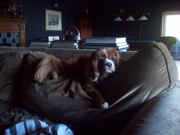 Here is a picture of my parent’s dog, kioshi, on our sofa. we were pet sitting him and this was his spot.