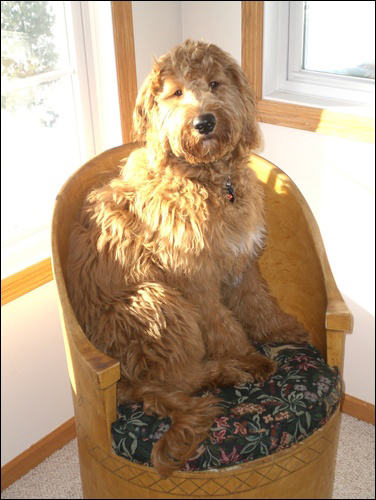 I would love to post this picture of my big boy Copper (he is a Goldendoodle) on a chair that was my Grandmothers.  It is a chair carved out of the trunk of a tree.  It is such a cool piece!  He fits just perfect in it and he loves to sit in it and look out the window.