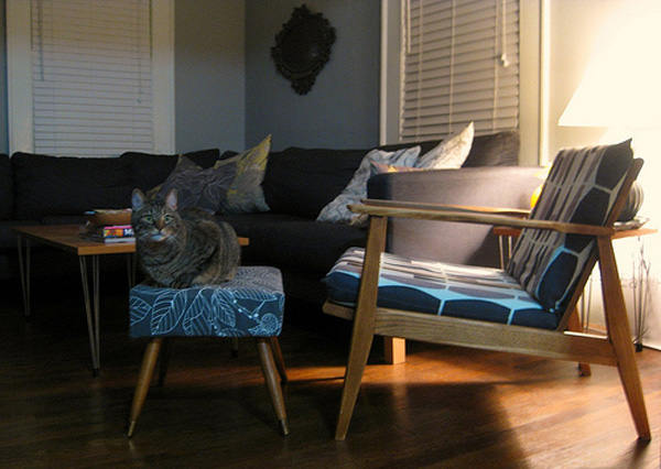 Here’s a picture of my step-cat Special getting the footstool I had just reupholstered nice and furry. (The stool fabric is from ikea and the cushion covers on the chair are fr west elm).