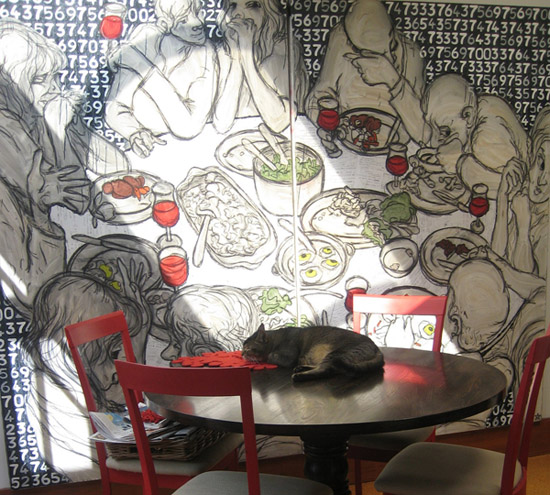 Camilla told me the mural is actually a painting titled "the Gods contemplating the fate of the universe". But unfortunately that’s all I know about it. (Perhaps she painted it?)