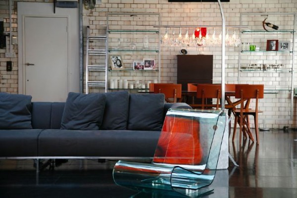 I love the location/building, the kitchen drawers, the chandelier for the toddler — in fact, the lighting is probably my favorite part. I’m not so certain about the deco. Imagine sitting naked on the plexiglass chair! And there’s something harsh and cold about the wall coverings… and weirdly, about the safety glass up the staircase. Ditto the shelving and tabletop. I like to see past the furnishings to a loft’s beautiful bones… but there’s more than enough room here to allow a few good pieces of furniture to have their due. It seems stingy — I mean, even the piano is more or less shoved into the corner — why? The storage piece in the child’s area? Again, the word cheap comes to mind.