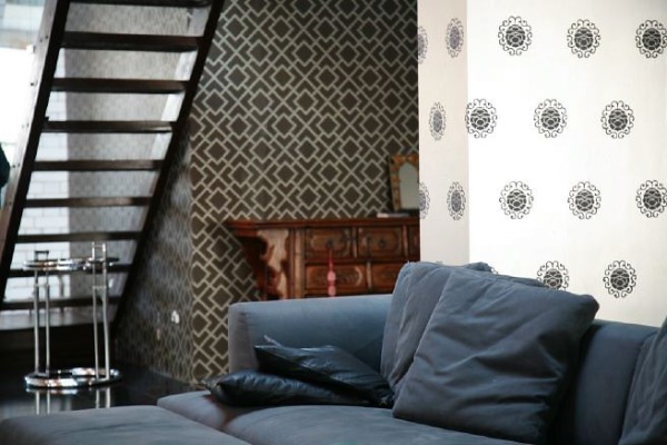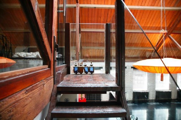 wow all the way around, from the patterned wallpaper to the exposed brick and wood to that loft bedroom with the glass wall for viewing the downstairs area. oh- my -gosh! truly inspiring 🙂