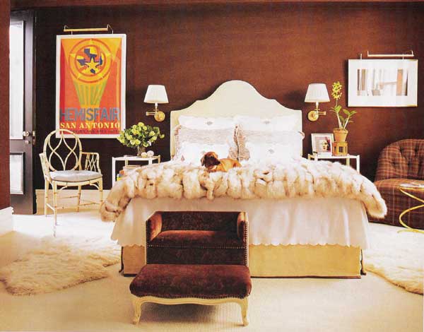 Wow. I love his use of color, and the not-quite-funky balancing touches. But is this designer as eternally devoted to the trad couch-table-flanking chairs tableau as it appears? The blue bedroom… yep.
