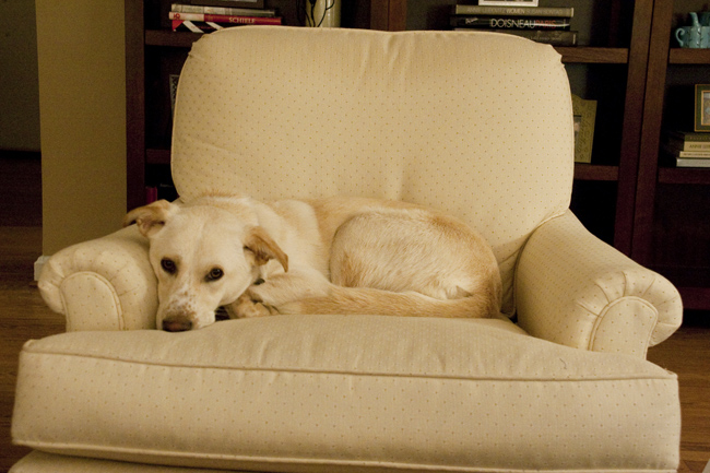 “Here is our puppy Abbie on her very favorite spot – one of our living room chairs. The chairs were handed down from my great-grandparents and we recovered them before adopting Abbie. We love how she matches the fabric so perfectly!”