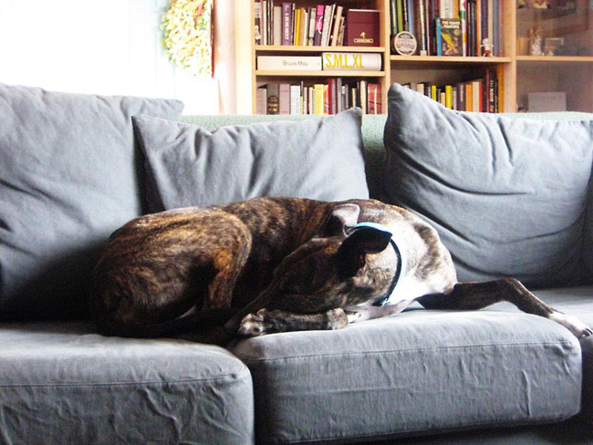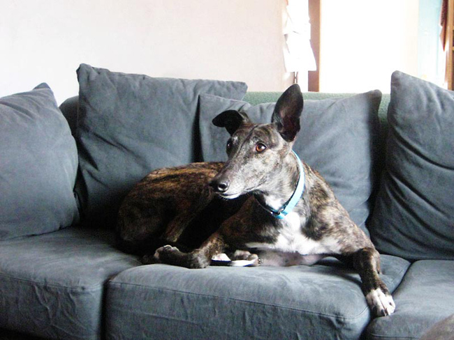 “Here are a few shots of Cheyenne, our 3-year-old, dark brindle, retired racing greyhound on our ancient Ikea Tomelilla couch.”