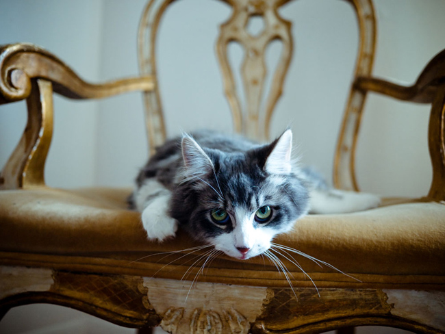 “I couldn’t resist sending you a shot of 5-month old Boomer on my favourite chair – a garage sale find if you can believe it! (the chair, not the cat 😉 There is a matching table that I use as a vanity in our bathroom. The gold tones really pop against our white walls. Thankfully, the fabric on the chair has not been appealing to Boomer’s claws… yet!”