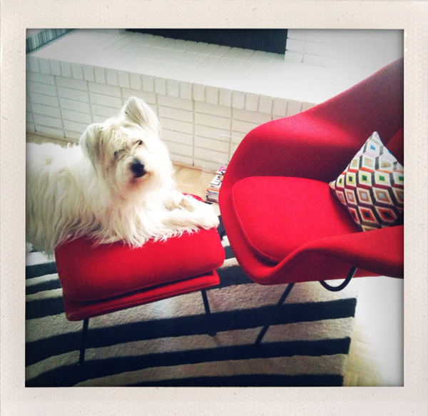 “Lucy’s favorite position for nylabone chewing is half on – half off the ottoman to my Saarinen womb chair. Some may be outraged that I let this happen but I finally just accepted that I live in Lucy’s house, she doesn’t live in mine.”