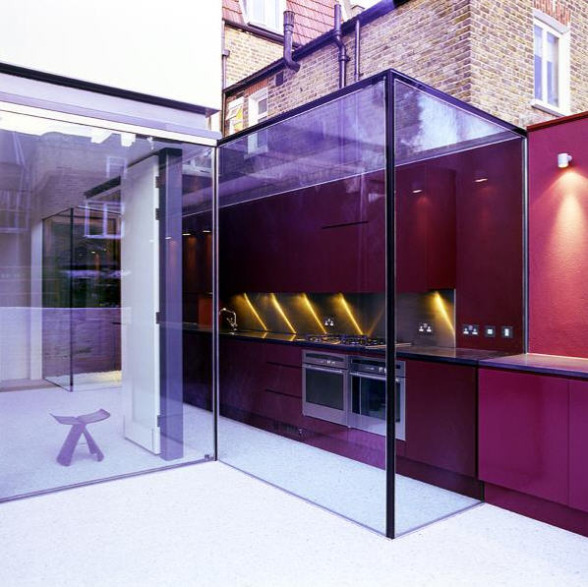 I am loving the glass box rooms; and how they acutally fit with every house they were put on. That red kitchen is making me smile!