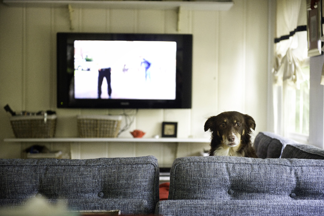 “Our 80 lb dog, Joey, basically rules the couch. He occasionally lets us have a tiny spot too, but only if we are prepared to love on him!”