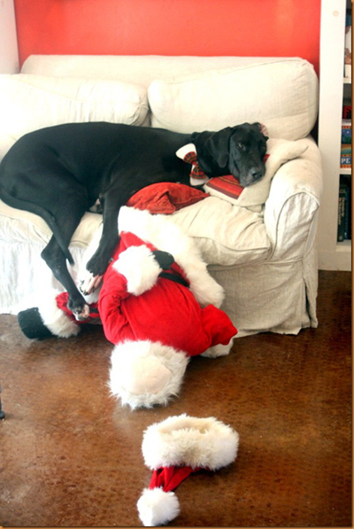 “A quick snapshot of my new puppy decked out in holiday garb, lounging (more like paralyzed with embarrassment) on the couch, and my coat and hat for that matter.”