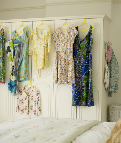 We’ve gotten several emails lately from readers asking for us to post photos to help inspire on all sorts of subjects and I thought I’d take a stab at one of them today. We received this email from Harpa: “I was wondering if you have any pictures showing an open closet or some clothing rails in a bedroom? I’ll be redoing my bedroom soon (when my littlest one gets his own room) and I want to have a small rail out in the open for some of my nicer clothes, or to organise my work clothes for the week. Some inspirational pictures would be very helpful 🙂” To my surprise I had a hard time finding photos in my stash for this one but I was intrigued to find some because I hope to redo my dressing room in the near future (how long have I been saying that? LOL) and my father is trying to convince me to have everything exposed (except maybe a bin or drawers for unmentionables). I’ve included some photos that feature something other than bars or open closets to give some other ideas for exposing clothing as well (ie. round rack, hooks, cute armoire whose doors could be removed).