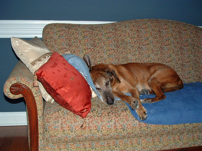“Here is my greyhound mix, Sammy, fast asleep on “his” sofa. It is an antique I inherited and in the (perhaps futile) hope of keeping it nice I’ve laid towels on it to protect the upholstery.”