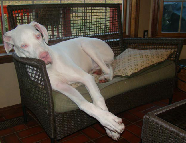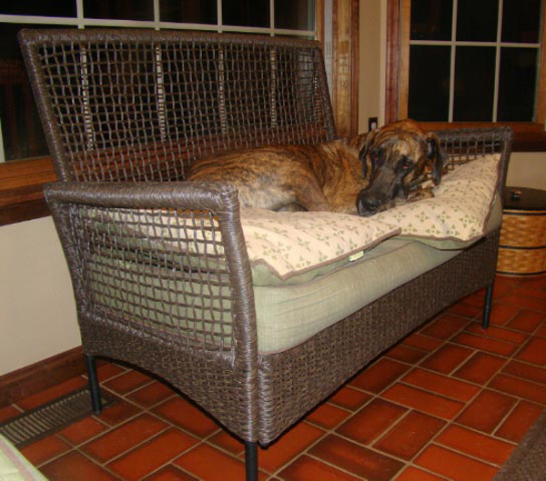 “This is my Harliquin Great Dane, Artimis, who thinks this wicker loveseat is HIS! Even when someone is on it…he’ll crawl up and sit on them as if to say ‘This is MY seat, thank-you!’
