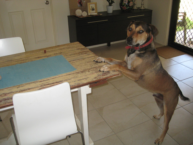 “Our dog Diesel likes to jump on every table we have in our house – but every time I seem to get the camera out to take a photo of him, he jumps off! The first photo is as close as I could get (this is our lovely dining table made from an old antique door that my Dad made for us). The second photo is his other favourite spot curled up on the end of our 3 seater couch!”