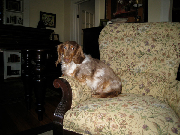 “This is my two-year-old longhair dachshund Bodhi. He’s a double dapple and has one blue eye and one brown eye, but it always comes out looking strange in photos. What’s funny about this is a put him in this chair just for a picture. He’d never seemed to notice the chair prior to this, but now I can’t seem to get the dog OUT of the chair. As you can see from my dog and my furniture, I’m quite a fan of the color brown.”