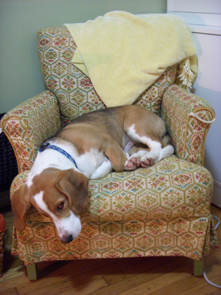 Barber, our half Basset Hound-half Australian Shepherd puppy is much too big for this garage sale find of a chair now, but he still loves to squeeze himself in there!  (And no, he didn’t chew that arm up; it came with some vintage “character” already!)