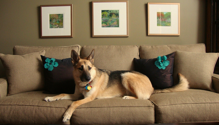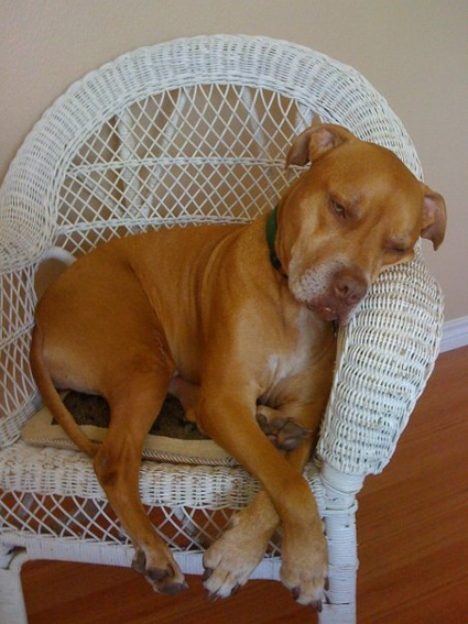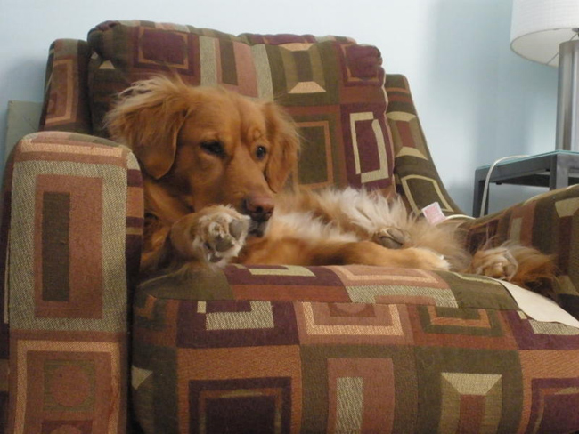 “Little did I know that my dog Reese and my chair would color coordinate! There have been times when I have looked all over the house to find her and never saw her curled up in this chair. She just blends right in. As you can see from the ‘patch’, Reese loved on this chair a little too much when she was a puppy!”
