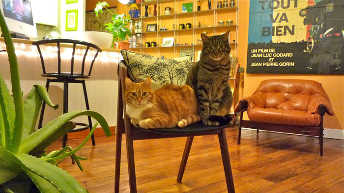 “This is Dylan (named for Bob), my rescued Maine coon, as he perches on my refurbished antique chair, which I purchased from the wonderful duo at Nightwood [nightwoodny.com] in Brooklyn. He is clearly saying, ‘Oh no! You caught me!’ (Well, actually he is cleaning up after eating.)”