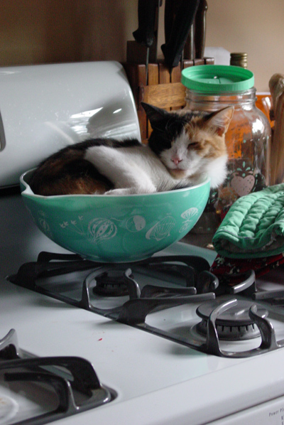 “We were all scratching our heads after seeing this. Where else does this little one get into when we are not at home. Walked in at the end of a work day, and my daughter finds my cat curled up in a bowl. on the stove!”