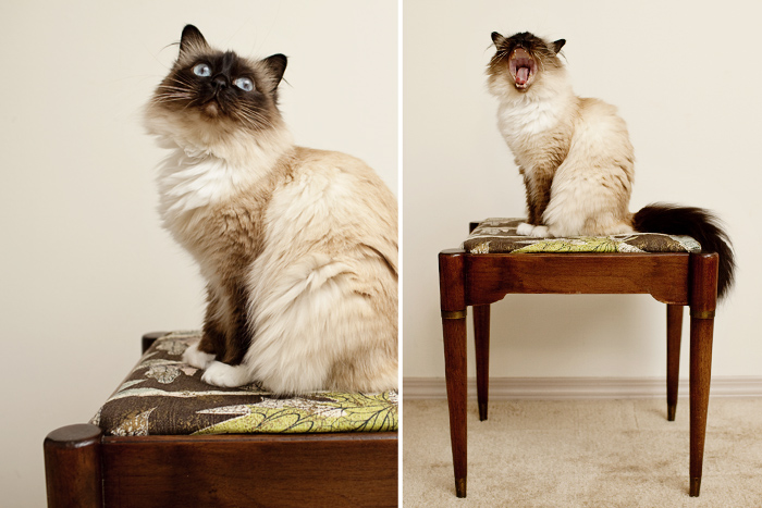 “This is my Birman, Charlie-Anne. I was actually trying to take a ‘before’ picture of this sewing bench, since I was about to reupholster and refinish it. But Charlie just assumed I had my camera out to snap some glamour shots of her, so she hopped up on the bench and struck a pose.”