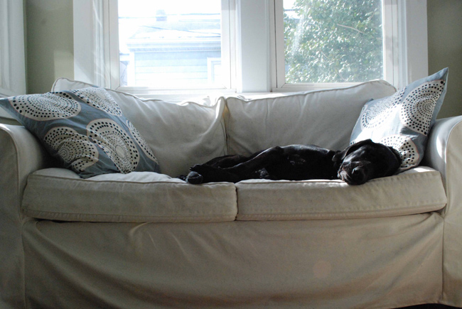 “This is my dog Venus, a 4-year old black lab. Her face is too cute to tell her to get off the furniture. This white couch is “her” couch. ( : ”