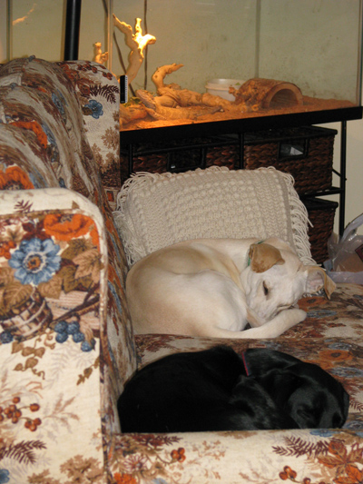 “I thought I’d send a couple pictures of our dogs on the couches (even though they technically aren’t allowed on the furniture!) for your pets on furniture posts. The first is of our dear Oliver. One night I couldn’t find him and after searching everywhere I found him fast asleep on the couch in the living room. (In the dark he looked like another pillow). The second is of both our dogs, Oliver and Roxy, enjoying the late morning sun. You can even see our bearded dragon, Aladar, in this photo!”
