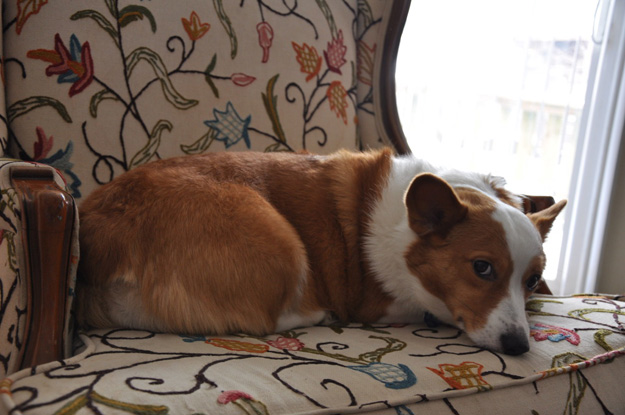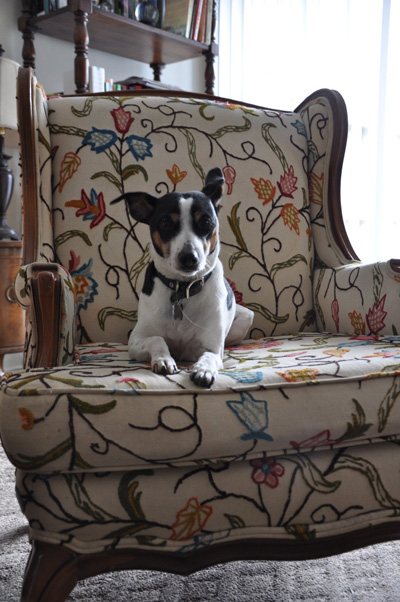 “These are my two dogs, Ringo ( rat terrier) and Bonnie ( Pembroke Corgi). There are two chairs. They belonged to my husband’s grandmother and I love the fabric.”