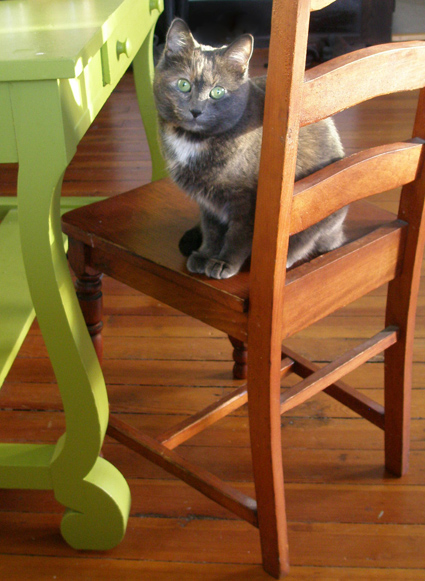 “Attached is a photo of my cat, named Mouse. She’s a former stray who I adopted last April when she was just a fur, bones and a skinny gray tail. Since she’s not allowed at my table, Mouse has figured out she can both watch me eat and beg silently by sitting patiently at my desk. Her tactic seems to work – maybe because her eyes match my dad’s old childhood desk so perfectly.”