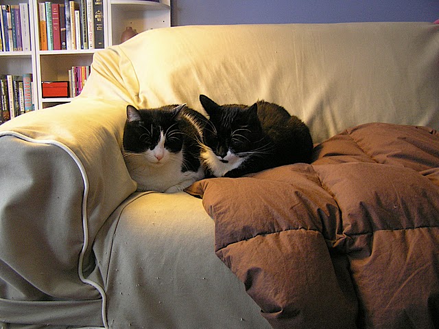 “During our recent spate of massive snowstorms, my cats Coco and Tommy kept warm by cuddling on the couch. And yes, the reason for that imperfectly-fitting slipcover is because of how much they scratched the original couch! Oh the sacrifices we make for these animals…”