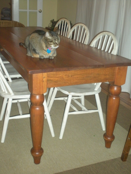 “One of the great mysteries of cats: Why do they lay on hard surfaces when there are so many cozier spots in the house? Here’s Sadie on our farm table. I like the second shot better, but she has the glowing eyes in that one.”