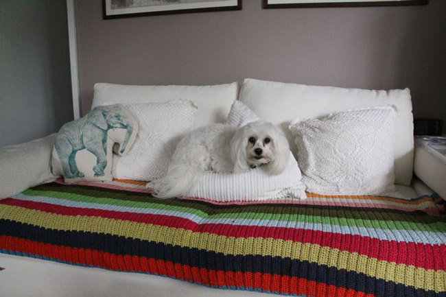 “Here is a picture of my Maltese X, Oscar, in his favourite spot. Hope you can include it in your post. The throw rug on the couch is a necessity, as cream couches and dogs aren’t a great mix! And here’s my cat, George, on the same couch. Apologies – it’s a bit too close and doesn’t show as much of the couch, but I love the way he’s tried to tuck himself under the throw!”