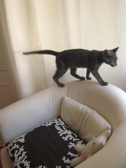 “I am sending you a photo of my very photogenic and value neutral cat Keats who I am sure would love to do a proper sit-down pose in his favorite IKEA Tullsta chair, if he could bring himself to actually stop and sit down for one second! Alas, there is too much exploring that needs to be done, and he rushes on…”