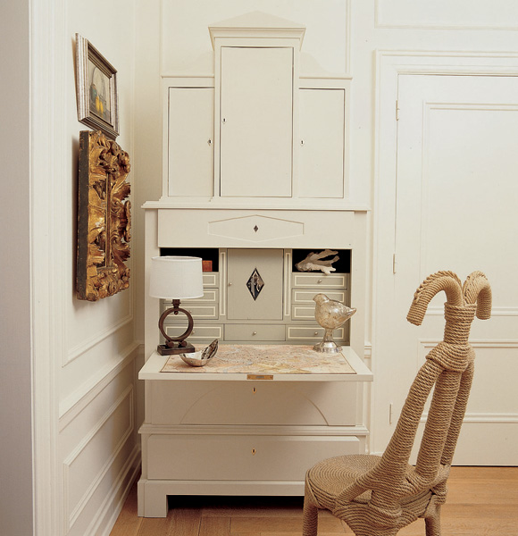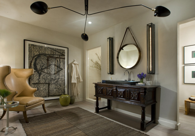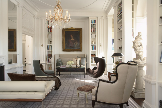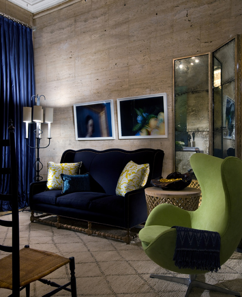 Unconventional elegance. I love that they turn what was obviously meant to be a dining room in an arts&crafts house into a conversation area — and it works. They love egg chairs, maybe more than is seemly, but ALL the chairs are chosen so carefully; althogh leather in a bathroom? I’ll object to that because of the squeakiness factor. The blue velvet room is my favorite (cue song) for the sheer exotic vibe it sends out.
