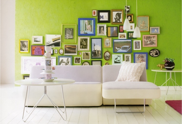 I love the zingy lime green walled living room with the casual art/photo display. I’d put this one down to Mexico with a modern twist.
