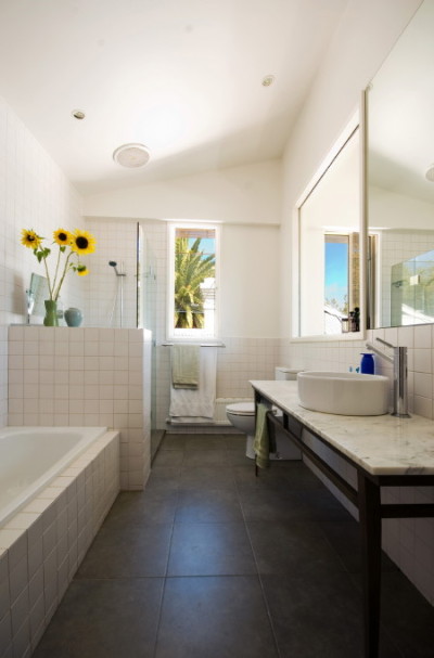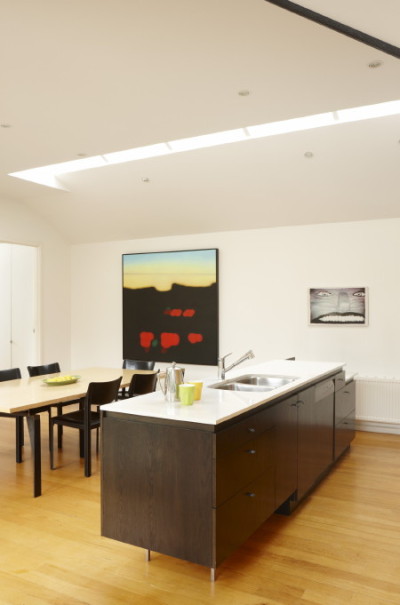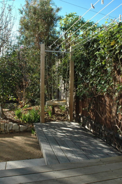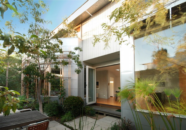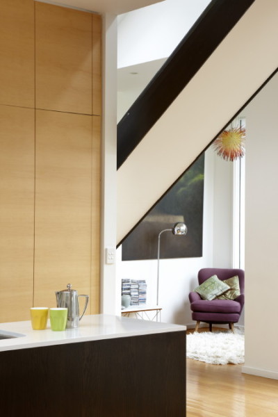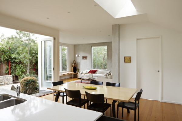 sensitive fashion. Old is tied to new, modern meets traditional. Bi-fold doors ensure a seamless flow from indoors to outdoors. It’s about bright sunlit spaces shaded by seasonal vines, strategically planted deciduous trees and overhangs. Think high end finishes with durability as the key and all on a tight budget. Even the clothesline was given the designer twist, with a rock weight/peg holder adding a bit of flair to a typically ordinary domestic object. Another stunning project by Marcus O’Reilly Architects.