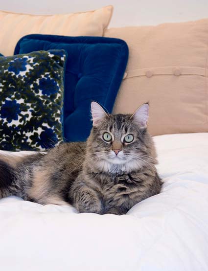 “My kitty sitting on my bed…hope this isn’t too much of a closeup. I just really like these pillows 🙂”