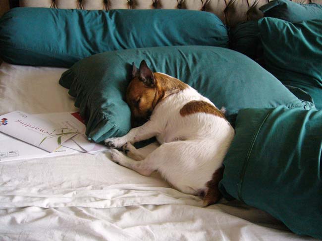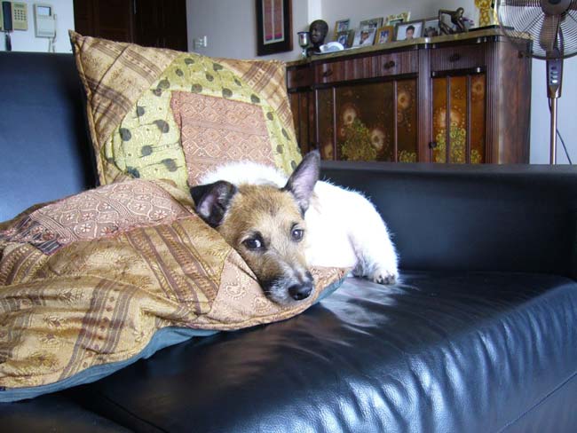 “This is our 6 years old Jack Russell, Toby, who simply loves sleeping and making himself cosy on our sofa, on our beds, and with pillows and cushions in tow!”