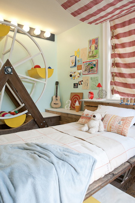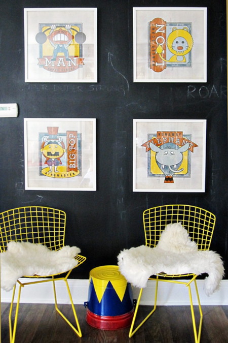 Themed kid’s rooms? Yay or nay? I would normally say nay. That was until today. Kansas based stylist Kate Dixon changed my mind with her amazing vintage circus room. No clichéd, tacky home-makeover-show nightmare. Kate and her team at Artistic Living Spaces create whimsical spaces that are also functional and so much fun! Look at that rug! And that bed! And the ferris wheel! And the chalkboard wall! And the height chart disguised as a game of strength. It’s all so clever, so stylish, so hip. I want to be a kid again. I’d be so cool in this room! You can follow the whole process on Kate’s blog.