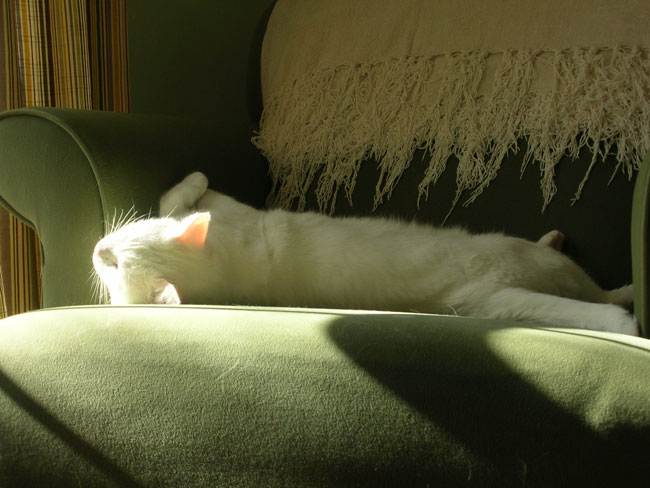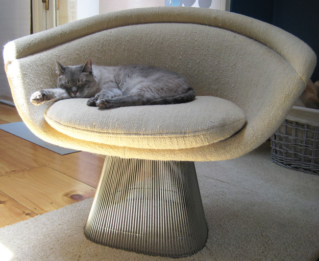 Attached is a photo of my beautiful rescue cat, Nino Pazzo, sleeping in his favorite spot on my favorite vintage find, a Platner chair. He gets direct sun in that chair all morning and soaks up as much of it as he can. Check out his paw reaching for the last bit of sunlight. What a life!