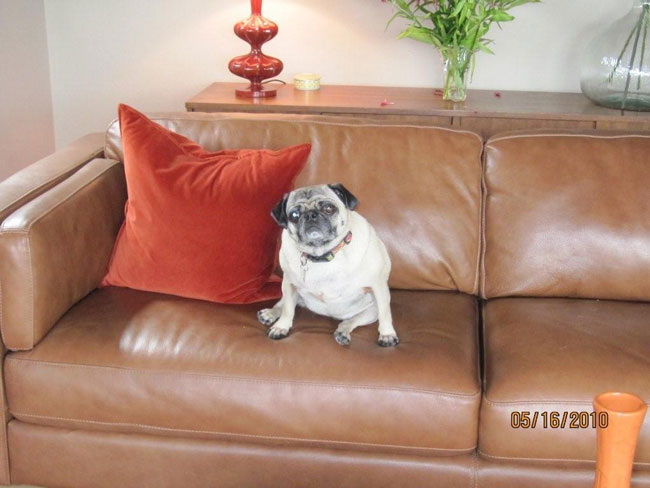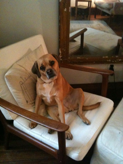 This is my dog Lola, who believes she is human, and sits like a human. She is a very serious, 5 yr old puggle.